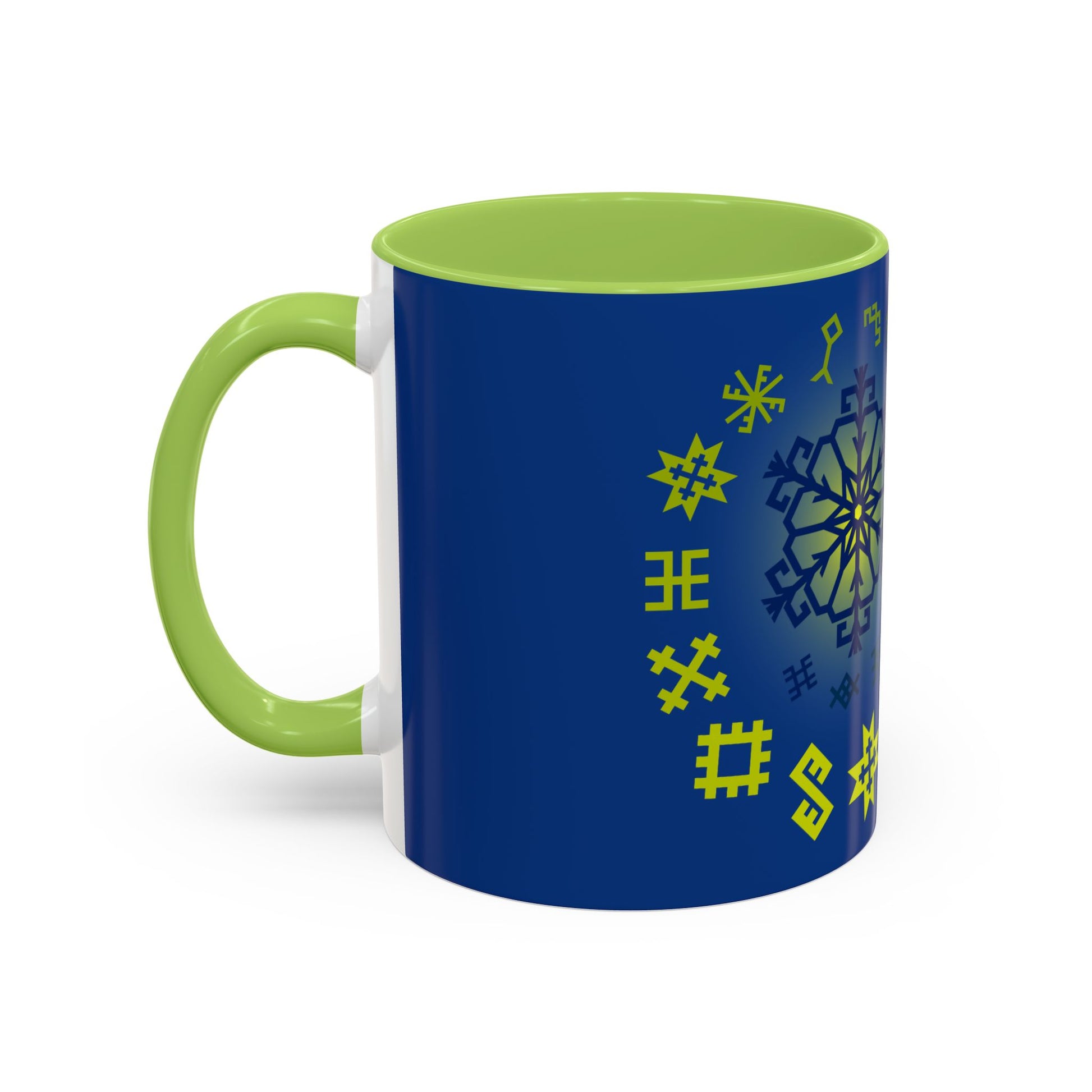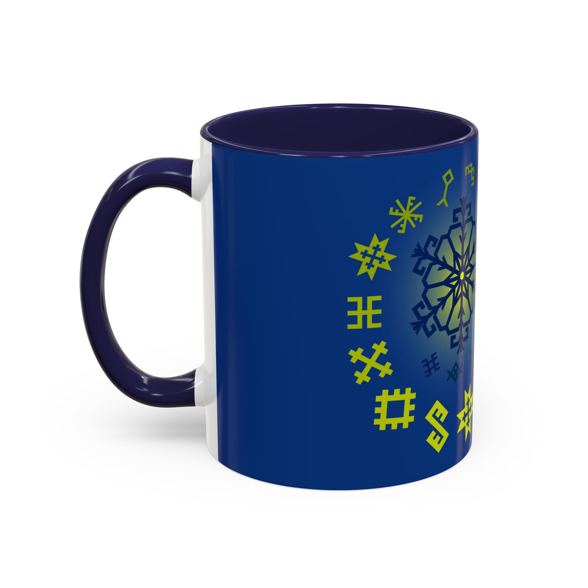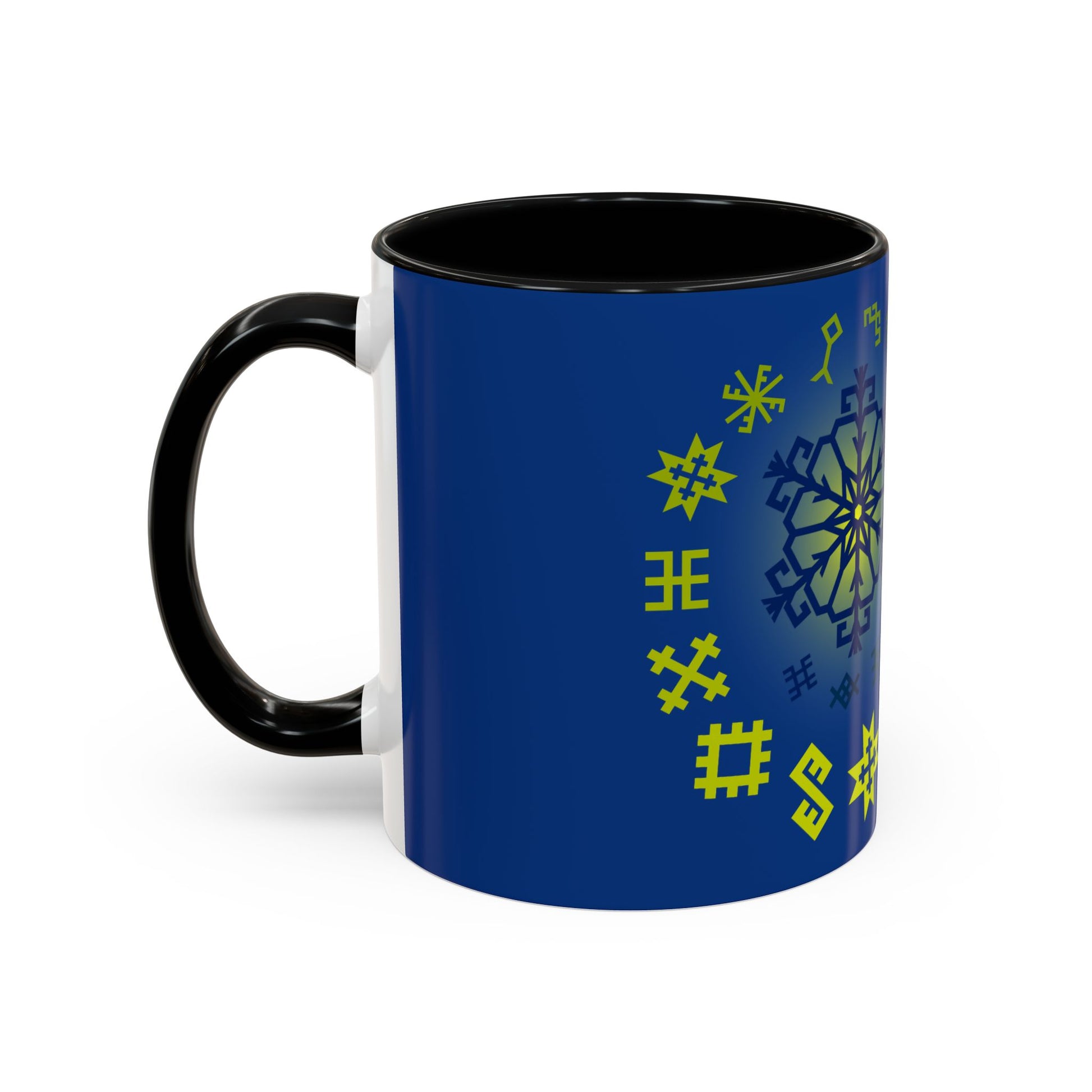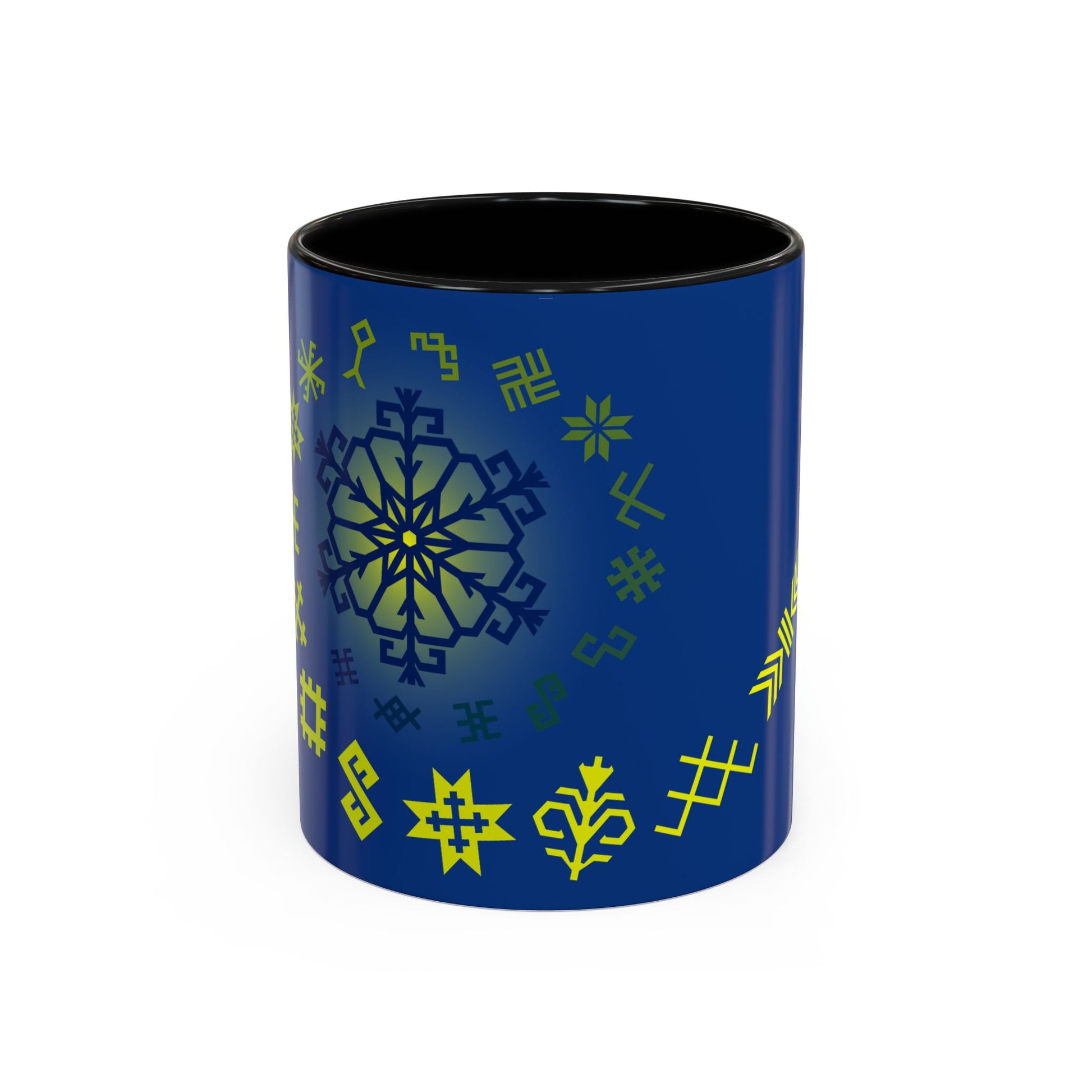 Warmth in hand and a quiet nod to heritage. This ceramic mug pairs a deep navy exterior with a glossy black interior and handle, and a ring of lime-yellow folk motifs that orbit a delicate snowflake-like medallion. It feels like a slow morning ritual in a cozy kitchen — fragrant coffee, soft light, and patterns that spark a memory of handcrafted textiles. Built sturdy for everyday use, it brings a little intentional beauty to routines and small gatherings alike.