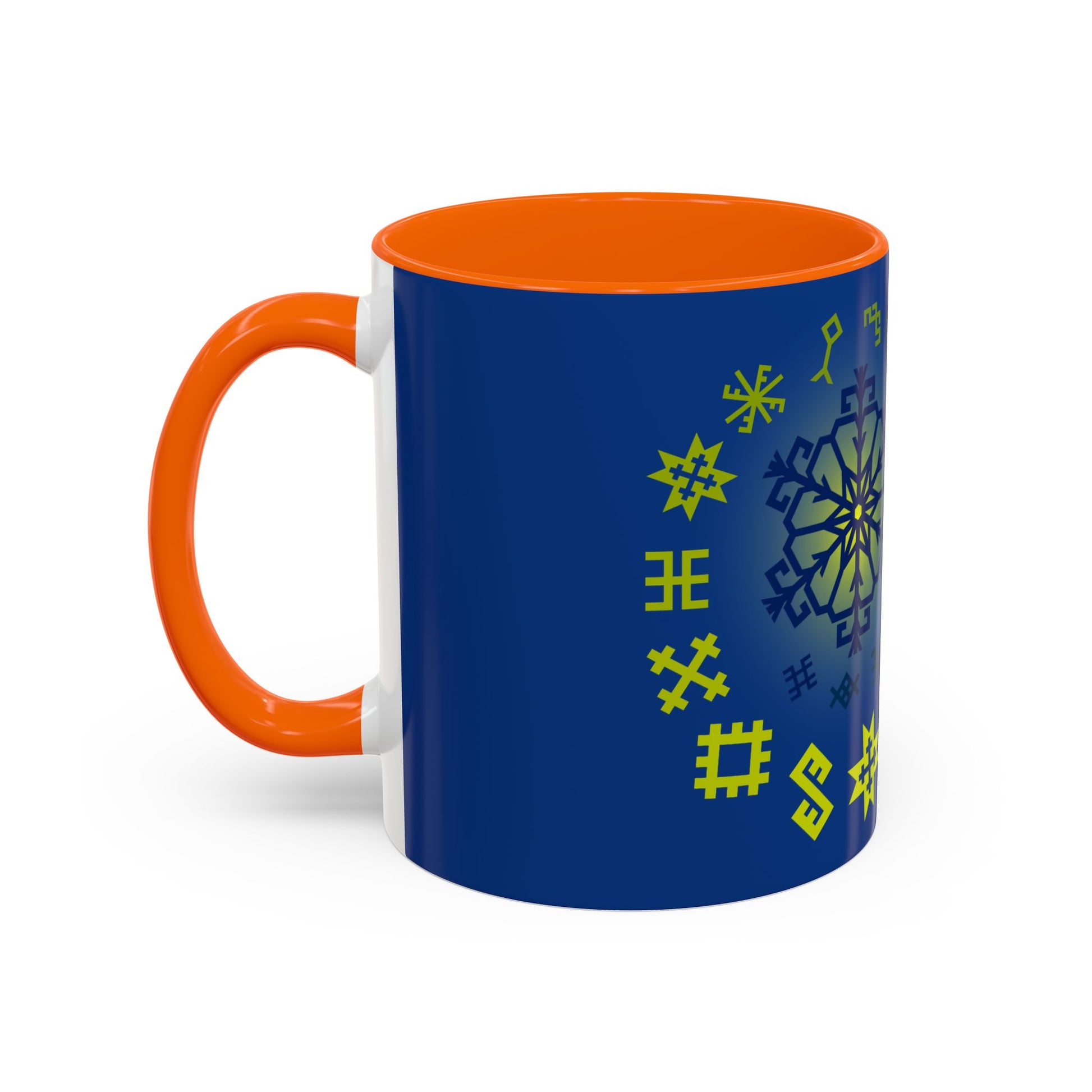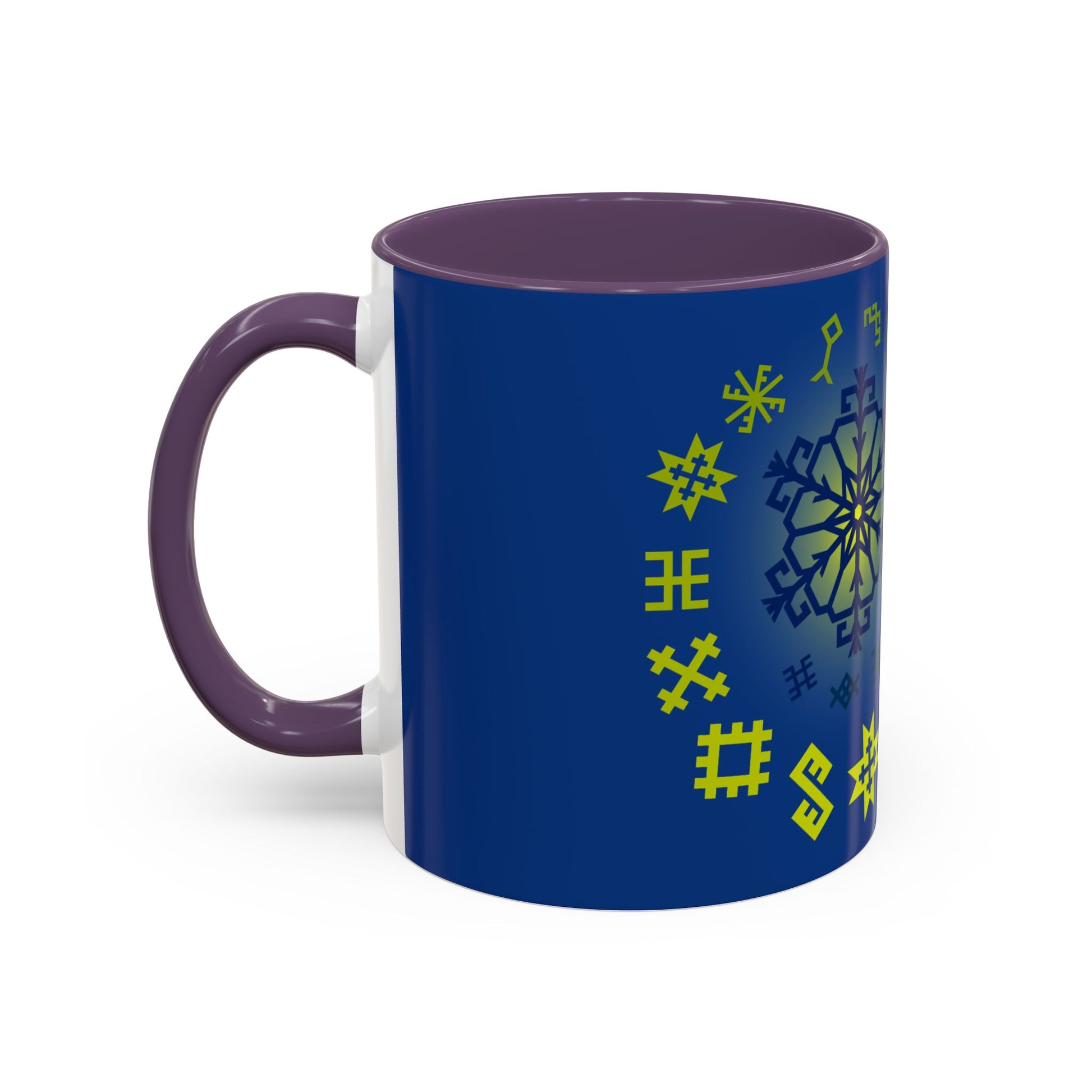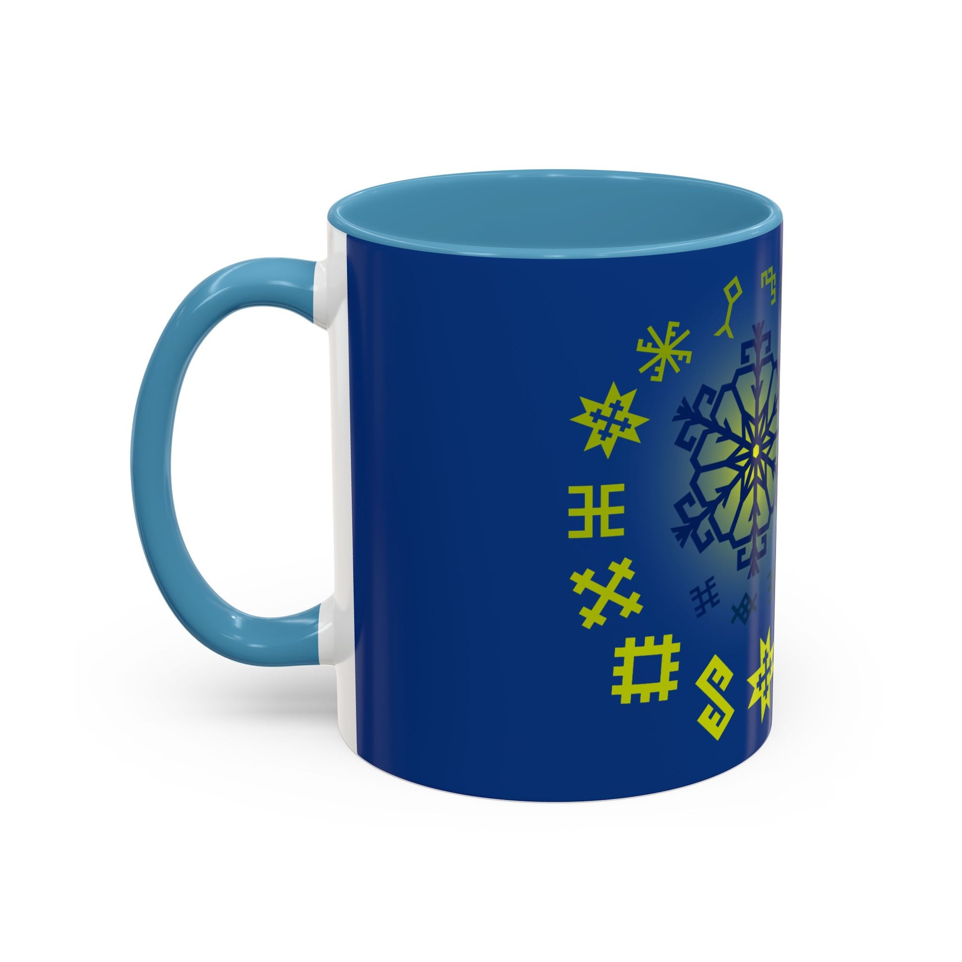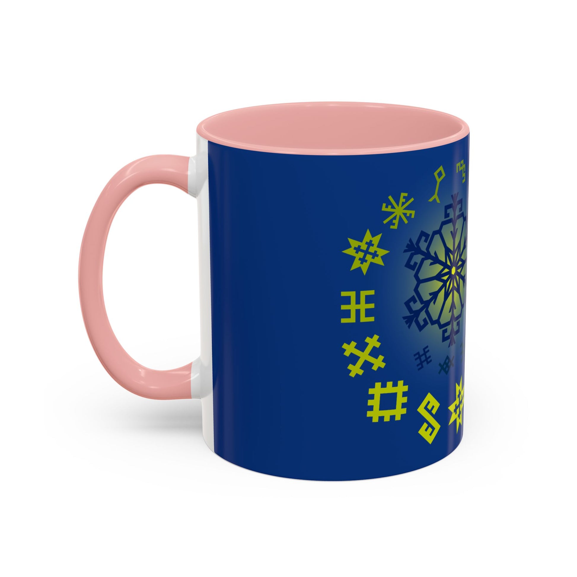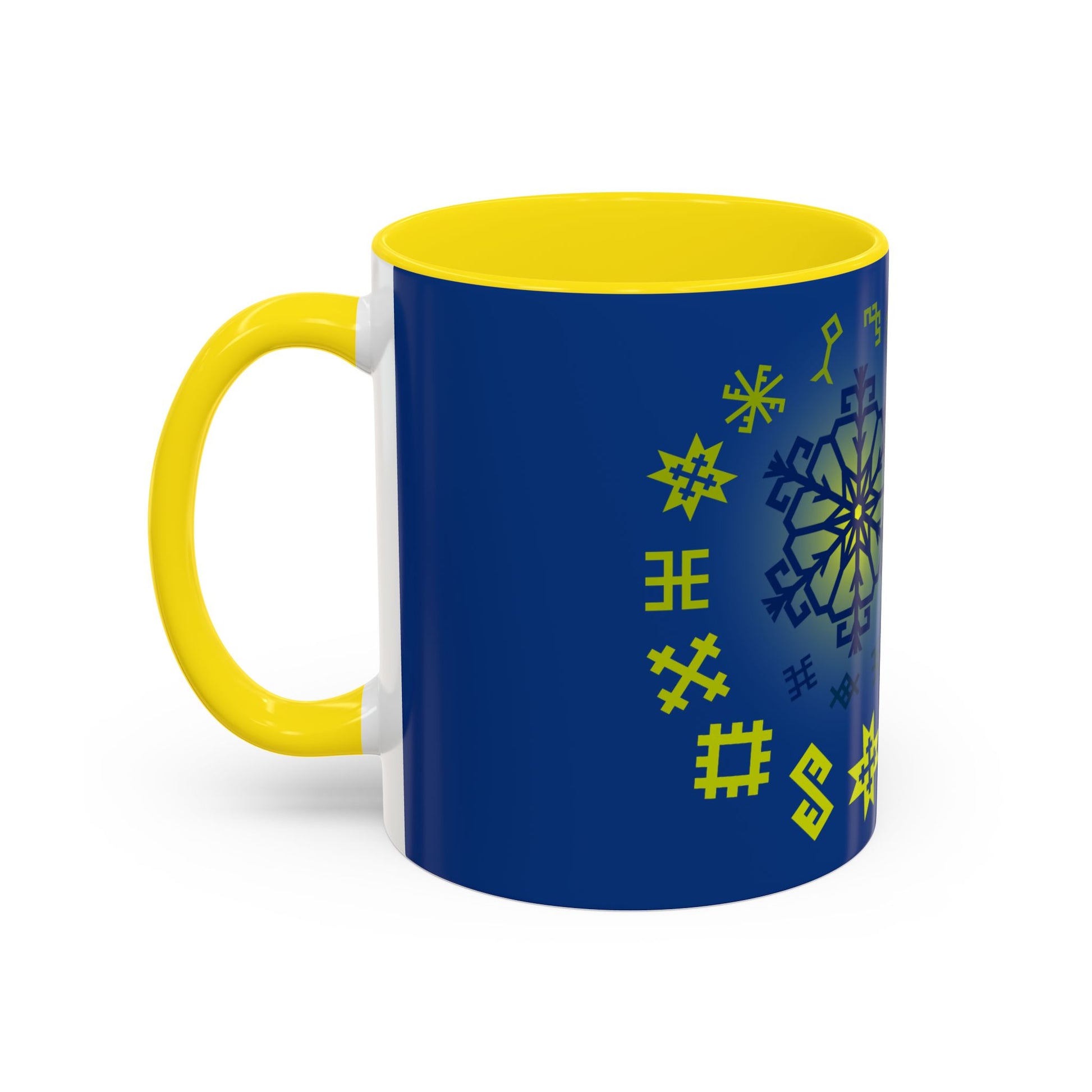Warmth in hand and a quiet nod to heritage. This ceramic mug pairs a deep navy exterior with a glossy black interior and handle, and a ring of lime-yellow folk motifs that orbit a delicate snowflake-like medallion. It feels like a slow morning ritual in a cozy kitchen — fragrant coffee, soft light, and patterns that spark a memory of handcrafted textiles. Built sturdy for everyday use, it brings a little intentional beauty to routines and small gatherings alike.