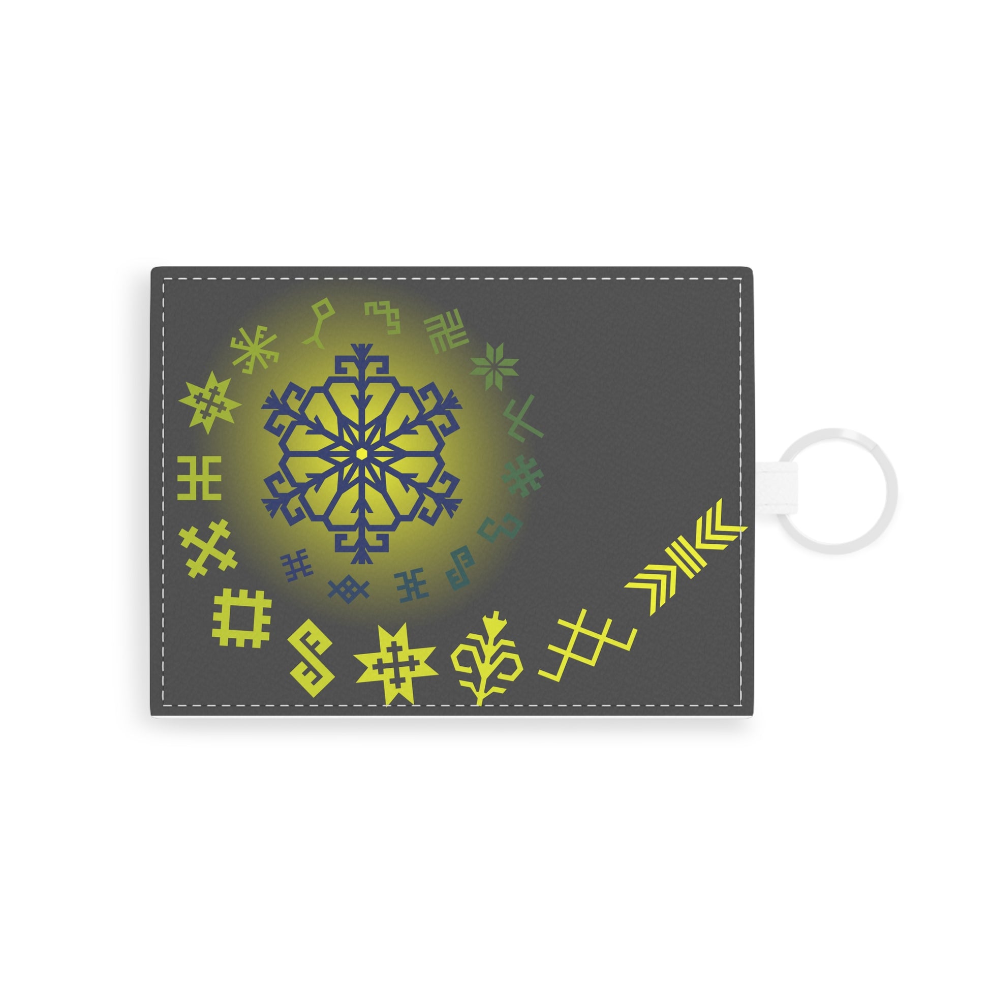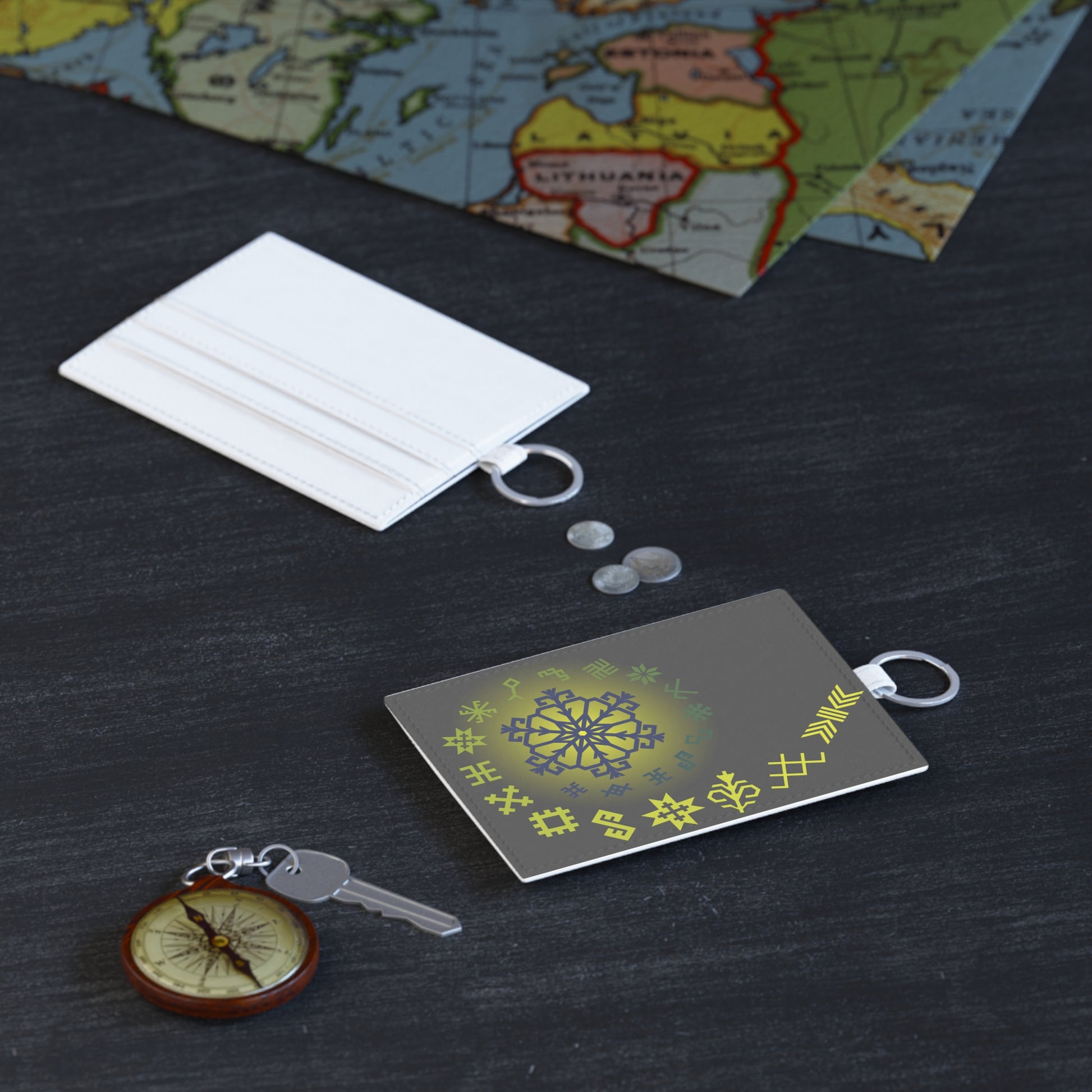 A slim, matte-finish Saffiano leather card holder that feels intentional in hand and light in the pocket. The front panel carries a modern, neon-accented mandala and rune-like symbols that glow against a charcoal field — a subtle mix of urban utility and folk-inspired graphic detail. Three ticket-sized pockets keep cards layered and accessible, while the metal keyring lets you clip the holder inside a bag or to keys for daily ease. Built from cruelty-free faux leather, it wears like leather without the upkeep. Use it on commute days, market runs, or when you want a little visual lift in your everyday carry.